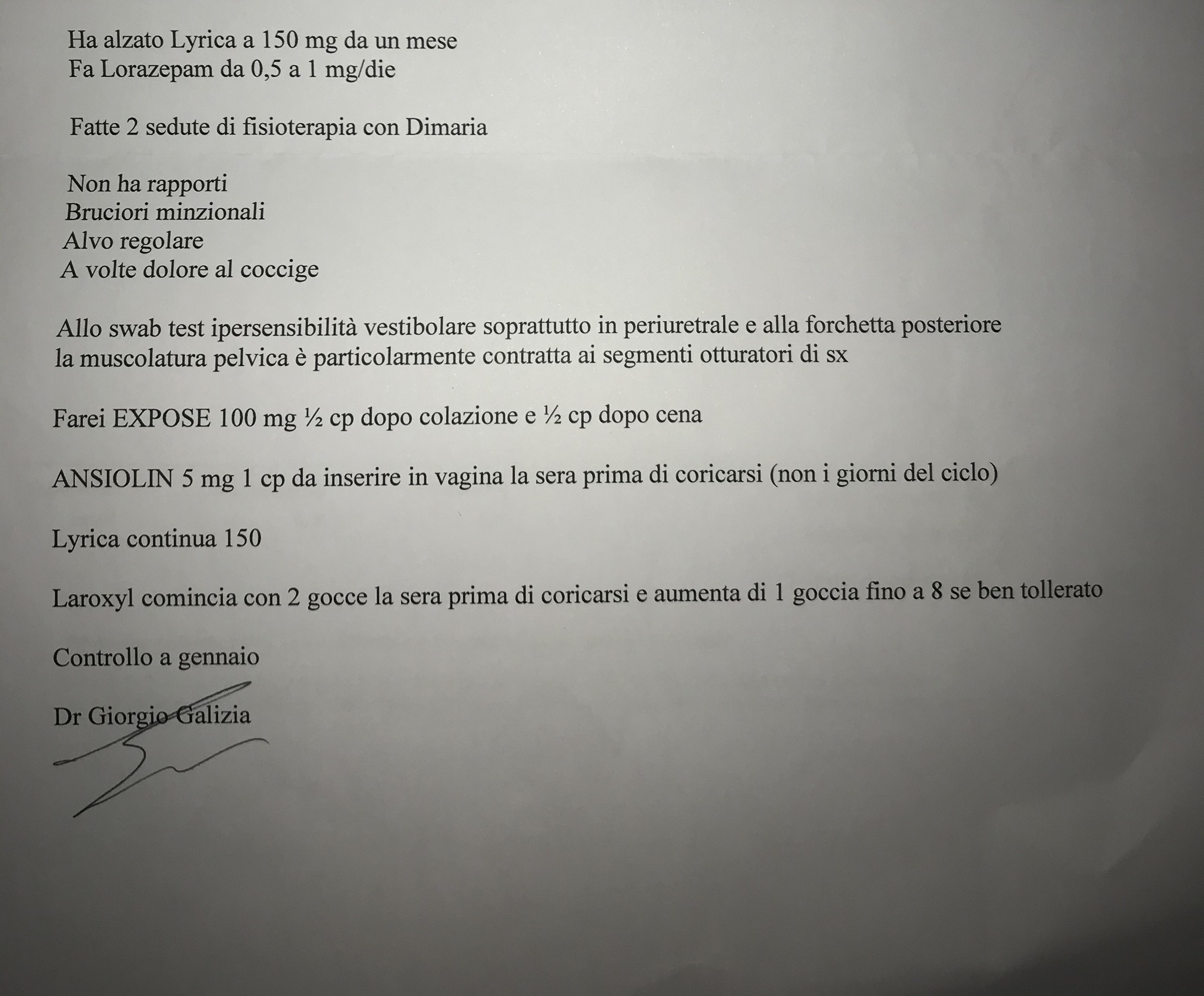 Ho iniziato ad aver sintomi nel 2014, approdata da Porru a marzo 2015 ( dopo mooooooooltissimi Pellegrinaggi, come la maggior parte di tutte noi) il quale non mi diagnostica vestibolodinia perché Swab test secondo lui negativo e muscoli normotonici. Mi prescrive comunque laroxyl. Maggio 2015, visita dal prof pesce: vestibolodinia media intensità e riabilitazione pavimento pelvico. Ho cominciato a stare poco meglio credo a fine 2016. Ah ho effettuato anche L elettroporazione con il dottor murina, e per me è stata positiva. E sono fermamente convinta di essere migliorata non solo grazie a tutti gli accorgimenti, riabilitazioni, massaggi, Farmaci, ma soprattutto grazie a una diversa consapevolezza psicologica. Rimanere in un loop di negatività è deleterio, ma comprendo che per essere più positivi bisogna Avere qualche piccolo miglioramento. Quindi quando ci sono, bisogna sfruttarli spronandosi cercare di essere positivi per quel poco. Non fossilizzarsi più sempre e solo sulla malattia per tutta la giornata e Alzarsi già con L ansia che comincia un’ altra giornata di m...a. Riuscendo a fare questo ( ci vuole davvero molto impegno) la strada è in discesa. Ad oggi che dire, posso avere rapporti anche lunghi e senza lubrificante ( dettagli a parte, ma credo che sareste felici di sapere cosa si può tornare o iniziare a fare