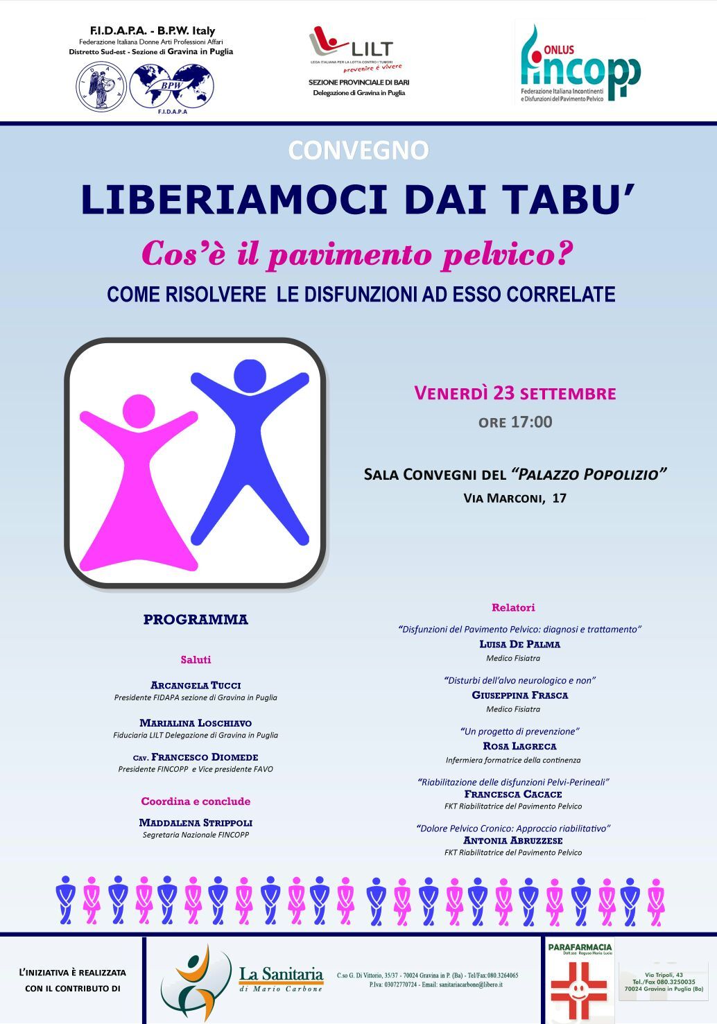 Le informazioni riportate in questo sito in nessun caso vogliono e possono costituire la formulazione di una diagnosi medica o sostituire una visita specialistica. I consigli riportati sono il frutto di un costante confronto tra donne affette da patologie urogenitali, che in nessun caso vogliono e possono sostituire la prescrizione di un trattamento o il rapporto diretto con il proprio medico curante. Si raccomanda pertanto di chiedere il parere del proprio medico prima di mettere in pratica qualsiasi consiglio o indicazione riportata